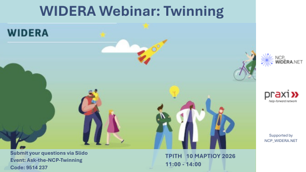 Το Δίκτυο ΠΡΑΞΗ/ITE, Εθνικό Σημείο Επαφής για τη θεματική Widening Participation and Strengthening of the European Research Area (WIDERA) του προγράμματος «Ορίζοντας Ευρώπη», διοργανώνει διαδικτυακό σεμινάριο για τις ανοιχτή προκήρυξη Twinning (HORIZON-WIDERA-2026-02-WIDENING-01) με καταληκτική ημερομηνία στις 9 Απριλίου 2026.